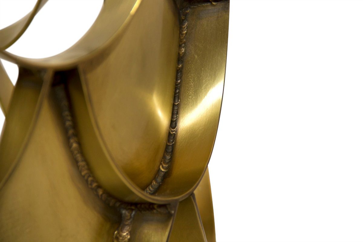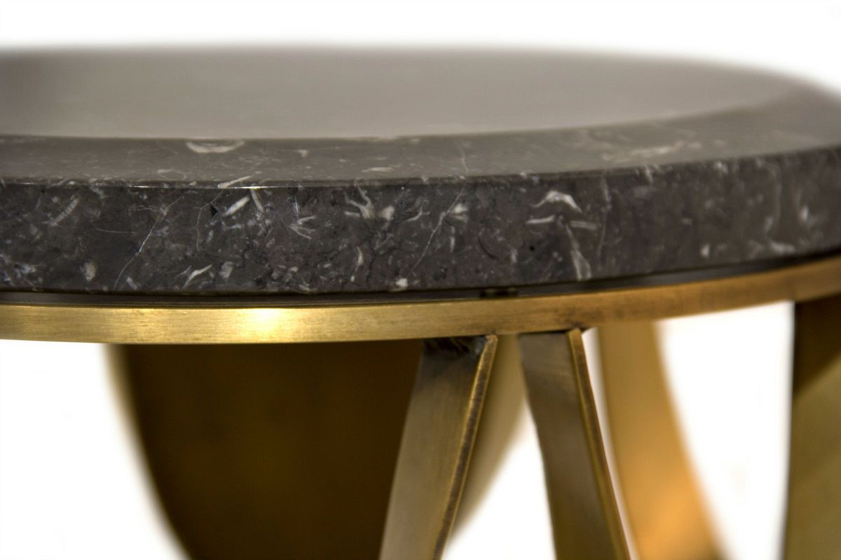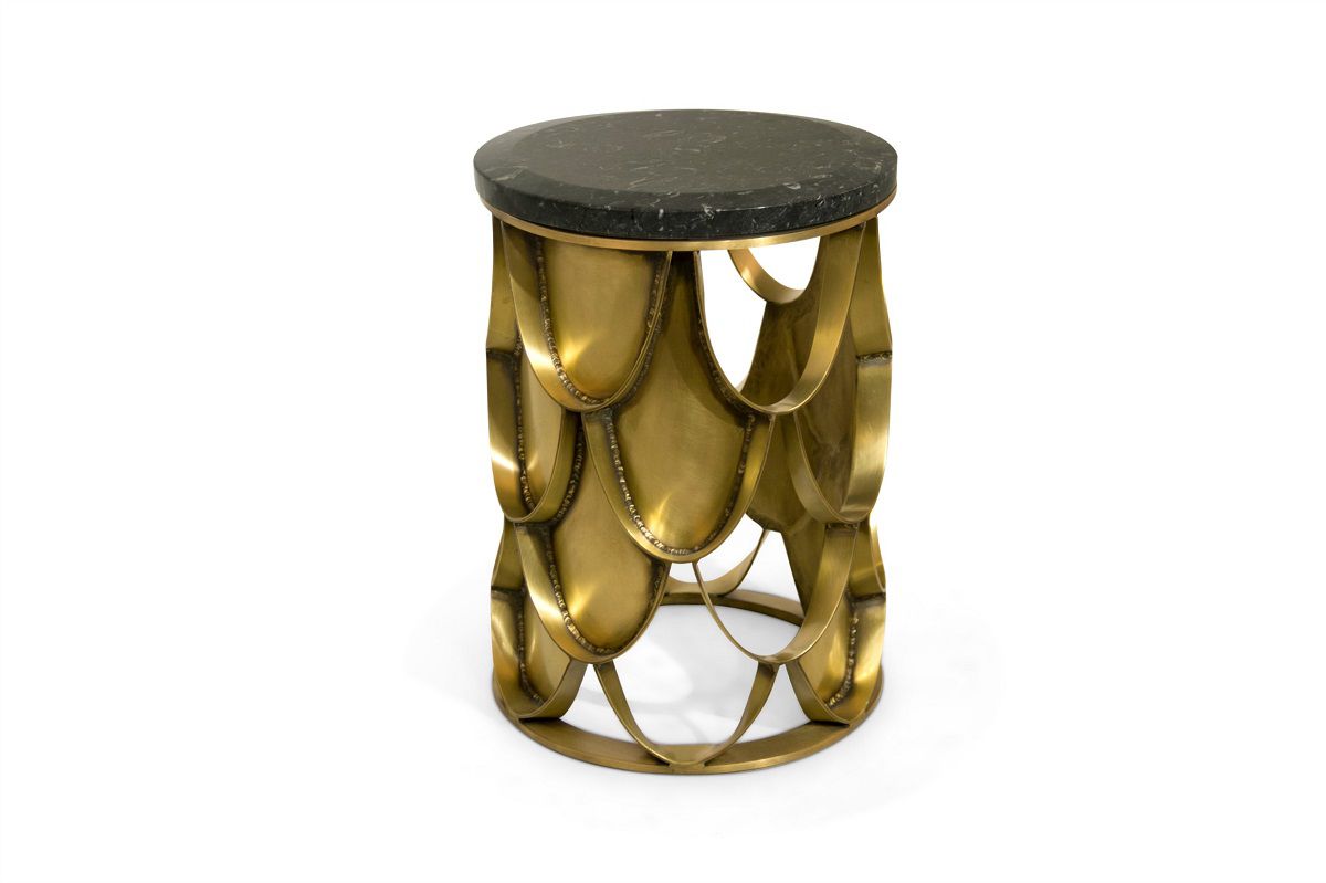 Un piccolo tavolo ispirato alle squame della carpa Koi. Questo tavolo conferisce esotismo e tranquillità agli interni di questo hotel. Con una base in ottone invecchiato spazzolato e la parte superiore in marmo, questo tavolino rotondo dona un tocco raffinato ed elegante.