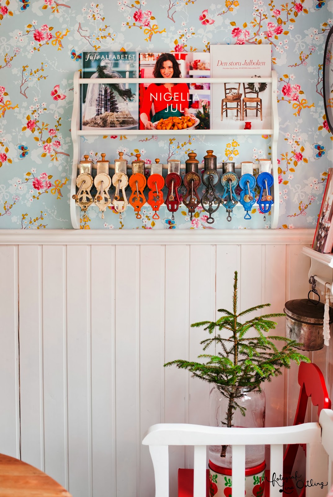 Insieme al rosso e all’abete che nell’angolo ci suggeriscono il Natale, troviamo un’allegra mostra di vecchi oggettini su una delle mensole.